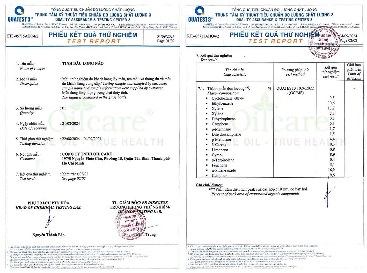 Xem chi tiết bảng kiểm nghiệm chất lượng Tinh Dầu Long Não bán buôn mới nhất của QUATEST 3